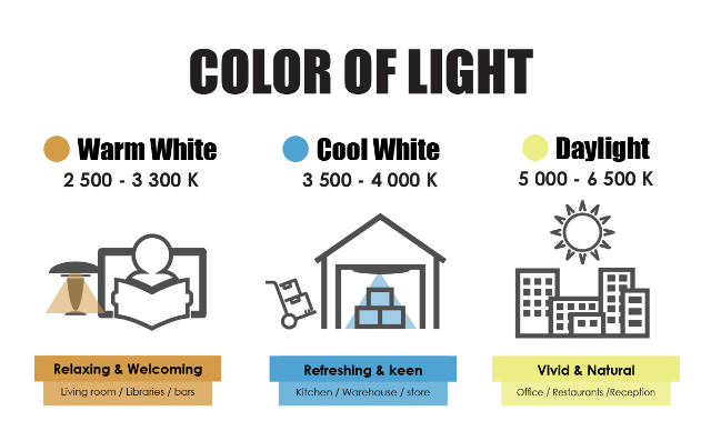 I tre tipi principali di temperatura di colore per l'illuminazione a LED sono: Soft White (2700K – 3000K), Bright White/Cool White (3500K – 4100K) e Daylight (5000K – 6500K).